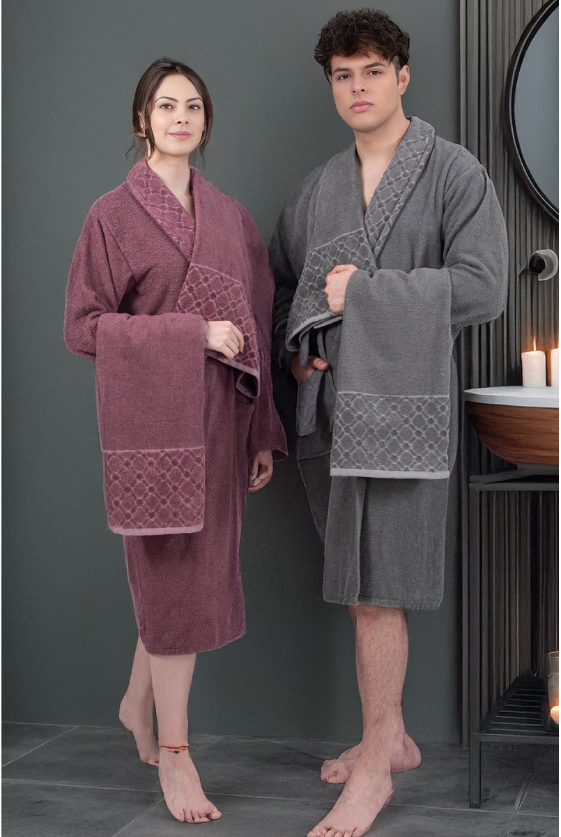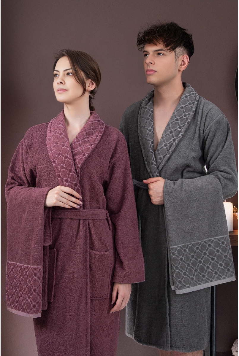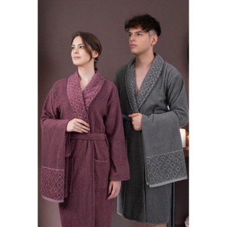 - Unisex tasarımı ile herkes için uygun, hem erkekler hem de kadınlar tarafından rahatlıkla kullanılabilir.; - Yüksek kaliteli %100 pamuk materyali sayesinde yumuşak dokunuşu ve konforlu yapısı ile öne çıkar.; - Midi boy bornoz uzunluğu, günün her anında ideal sıcaklıkta koruma sunar.; - Antrasit-mürdüm renk seçeneğiyle şık ve modern bir görünüm sağlar; ev dekorasyonunuza kolayca uyum sağlar.; - Nakışlı ve işlemeli deseniyle estetik detaylar ekleyerek kişisel zevkinizi yansıtır.; - Cepli tasarımı pratik kullanım imkanı sunarken, günlük eşyalarınız için güvenli saklama alanları oluşturur.; - 30 derecede yıkama talimatına uyarak uzun süreli kullanım için ideal bakım önerisini sunar.